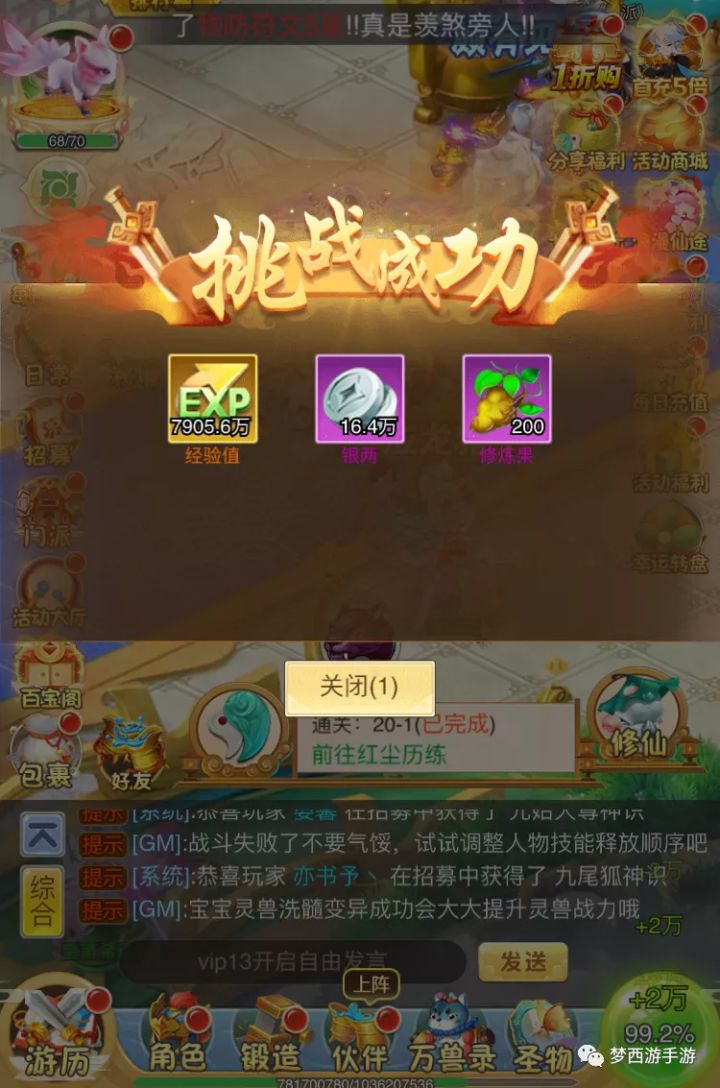 了解完《梦西游》的大概内容以及相应的作用后,就到我们快速提升战力问题了。那梦梦继续给大家整理一些快速提升战力攻略,快拿小板凳坐好啦!一、主线剧情进入游戏后小仙友们先跟着主线走剧情,主线的章节闯关是仙友获取经验、勾玉、银两、星核、修炼果的最好也是最快速的方法。(PS:觉得战斗过程麻烦,可以一键跳过战斗!)得到奖励后仙友们就可以去升级角色的技能、培养坐骑和灵宠、修炼出战伙伴以及升阶,实现全方位的提