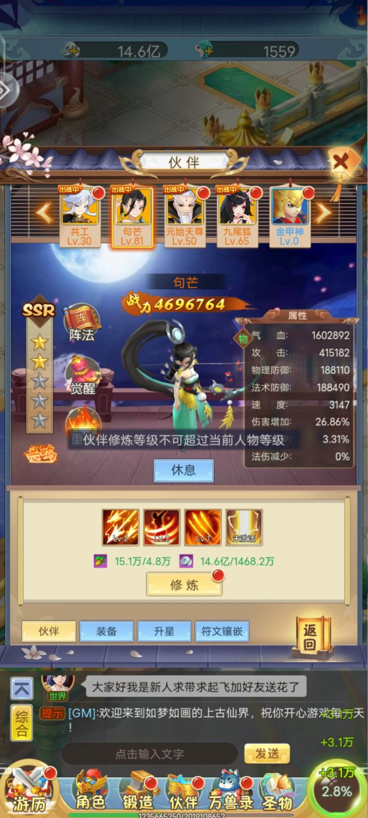 #梦西游#伙伴篇前期不管白嫖还是氪金 都给我往死里冲句芒(前期开荒还是打架无敌好用,越战必备) 把所有的资源都往句芒身上砸 如果你是白嫖党 前期就冲句芒氪金党可以培养其他几个辅助句芒的仙神比如ssr天羽(给句芒加伤害 最好速度比句芒快 上速度符文)练到三星就可以了ssr九尾(主要打控制 可以眩晕一列目标)这个可以不用怎么升红色仙神伏羲和黄帝二选一(土豪忽略选择)这两个可以打造成副C助