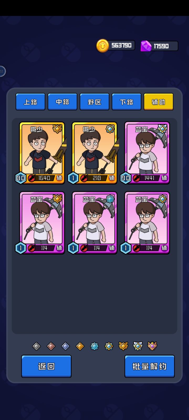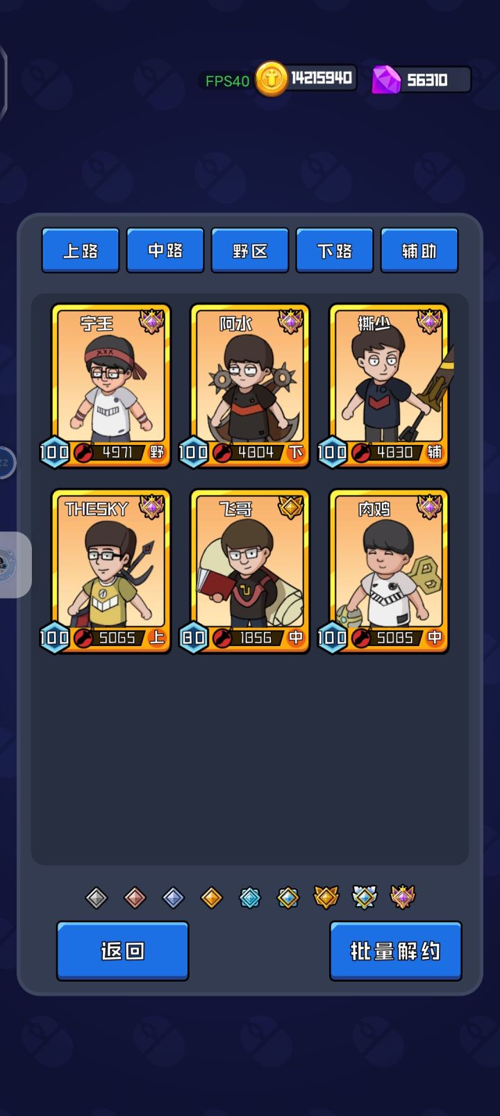 bug游戏,稍微研究一下就会发现钻石和金币是无限的。说几个点把,很容易“通关”1.过关时的对手会根据你的战力增加儿增加,所以靠增战力过关是没用的,其实过关只需要点加速键,不管你战力够不够,都能过关。2.需要的资源是金币和钻石,稍微有点金币就可以去开英雄,只要是能用金币买的都买,看广告的别点,浪费时间。买的英雄去分解,获得大量钻石。有了钻石去超神商场不停的花500钻石换金币,这样一来金币只会越来越多。3.这个游戏唯一需要养成的是俱乐部等级,上条获得的金币用来升电脑配置从而提升俱乐部等级,俱乐部等级提升到8,14,22,32,42级就能开新级别的抽卡,对应的就是白银,黄金,钻石,大师。开了新等级后插抽卡区就在最新的级别抽卡。4.这个游戏不需要看广告,抽卡?胜利奖励翻倍?都不需要看广告。附上玩了3个小时的成果,图没咋推,没啥动力。