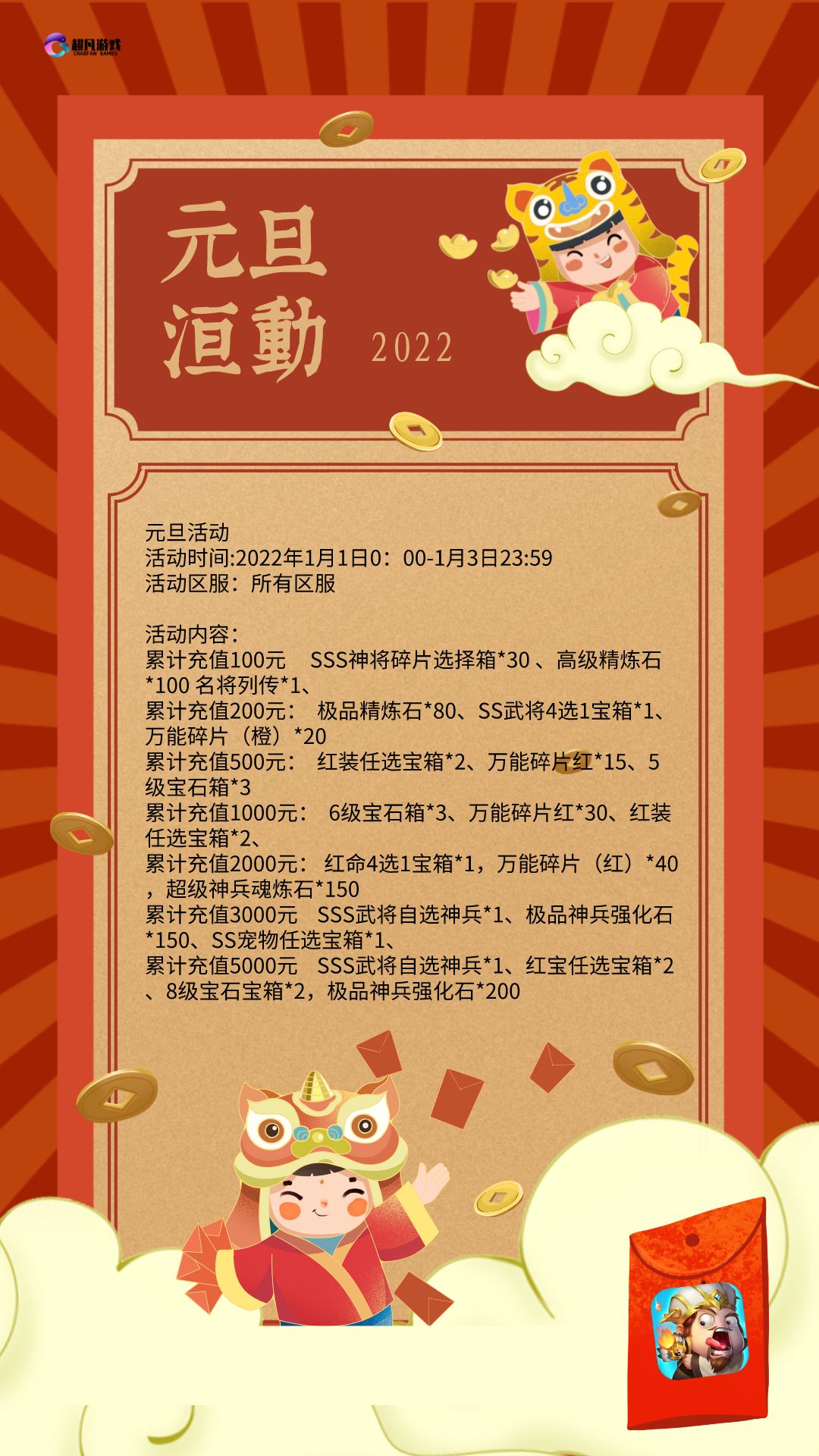 元旦活动 活动时间:2022年1月1日0:00-1月3日23:59 活动区服:所有区服 活动内容: 累计充值100元 SSS神将碎片选择箱*30 、高级精炼石*100 名将列传*1、 累计充值200元: 极品精炼石*80、SS武将4选1宝箱*1、万能碎片(橙)*20 累计充值500元: 红装任选宝箱*2、万能碎片红*15、5级宝石箱*3 累计充值1000元: 6级宝石箱*3、万能碎片红*30、红装