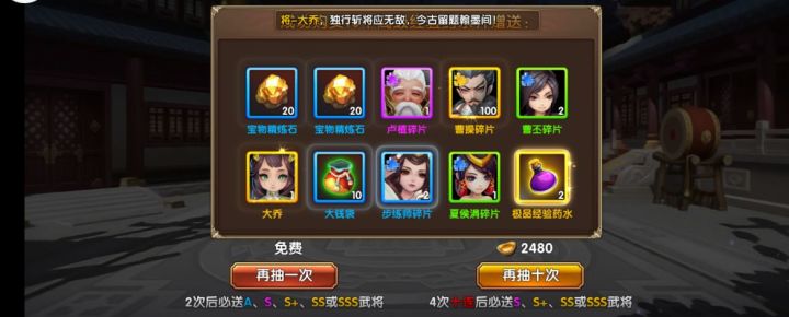 有很多玩家不知道怎么去搞SSS武将和神兵等等稀有物品,下面我告诉您稀有物品如何获取!废话少说先上礼包码:T198NJE2N7385PGF59Q(数量有限先到先得)SSS神将:登入送SSS神将:每周首充找客服登记神将活动第一周20碎片、第二周30、第三周40、第4周60第4周将合成一个SSS神将。小额充值:每天300元宝 每天可以获得10个SSS神将任选碎片宝箱和其他物品,第6天获得名将列传
