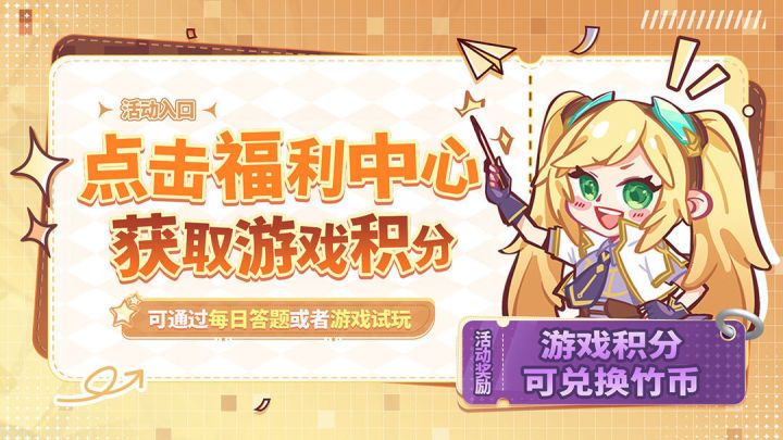 点击游戏内悬浮窗(大熊APP)一一福利中心一一每日答题或者游戏试玩,即可获取游戏积分哦~ 游戏积分可以兑换竹币