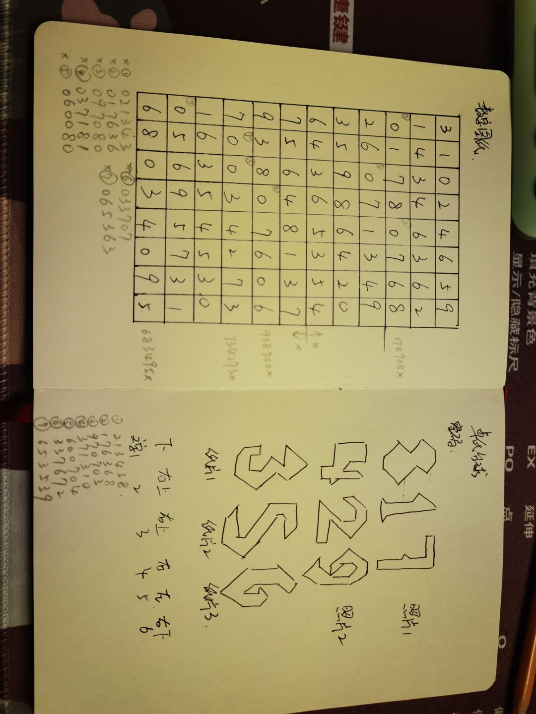 请忽略我自己画的七巧板数字(特别丑...) 首先七巧板数字中没有0,所以我优先在数字图表中选出0,再筛去不满足文字方向提示的0,最终得出了7组数,都试过了不对。 然后将图表每一列由上至下分成两组6位数,全部试过了不对。 再接下来把横向中有两个0的挑出来去0留数得出4组6位数,全试过了不对。 所以大家可以排除以上思路再去解密码了~