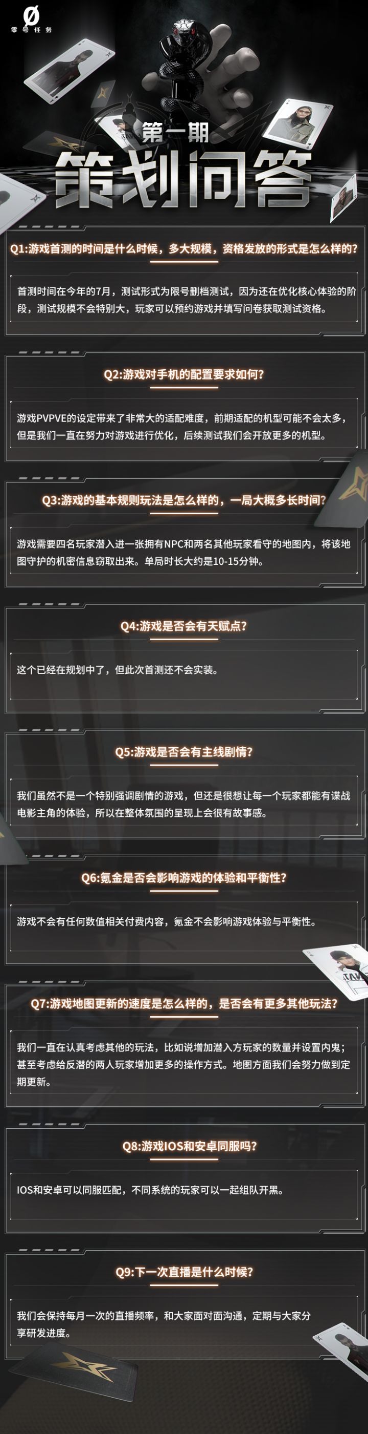 探员们周末好~这里是大家的贴心后勤小欧不知探员们有没有收看周五我们的首次策划面对面直播呢?如果没能赶上也没有关系小欧已经整理好了直播期间策划对探员问题的回答下面就让我们一起来回顾吧官方首播真的是爆出了很多猛料呢!探员们如果还有更多想要了解的问题欢迎回帖留言小欧的40米大刀已经磨好准备进行下一次的“友好协商”了~