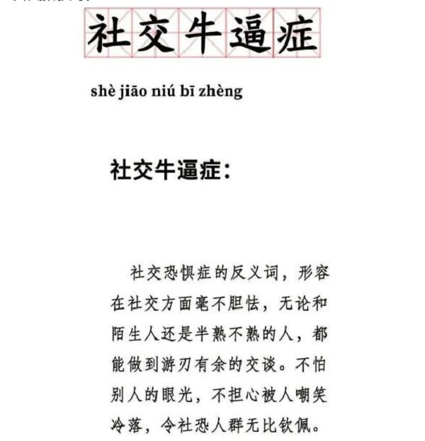 在社交恐惧症成为许多年轻人标配的当下,社交牛pi症横空出世。作为社交恐惧症的极端反差,社交牛pi症指在社交方面完全没有压力,放飞自我,游刃有余。《君王3D》的各位主公get到了吗?“社交牛pi症”这个词的爆红,始于“古早”网红焦双喜。网友在焦双喜的相关视频下面将其风格总结为社交牛pi症。不仅焦双喜靠着社交牛pi症成功翻红,也有许许多多的人开始了社交恐惧症的模仿和创作,从而获得点击和流量。最初的