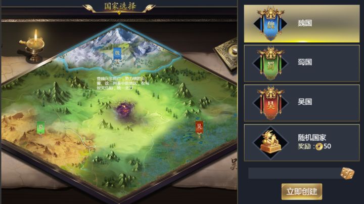 东汉末年,汉室颓态已现,各方势力涌起,局势变幻莫测,主公志存高远,在进入游戏之时,可选一国家效力,治世能臣还是乱世奸雄,皆随主公心意。主公在建立角色时可选择效力国家,选择完毕也会有对应的提示和奖励。【魏国】曹魏兵多将广,势力横跨兖、豫、徐三州兼中原地区,收匈奴灭乌桓,统一北方。【蜀国】蜀汉兵起荆州,进西川,攻汉中,收南蛮,疆域富庶,天府之国。【吴国】东吴据长江天险,坐拥江南,富泽一方,其兵
