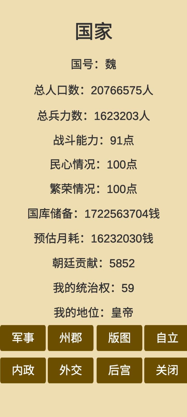 做皇帝前的攻略,现在版本做了皇帝感觉有bug1:国家尽量选汉国,有个不参加兵变可以直接升丞相(做了皇帝也好打)2:我是做文官的,就是先把繁荣升到80,保持住等升官,然后把钱存钱庄里(升第二个官的官前钱全都用来加健康就行,评论区全是说这的)3:升到第三个官时可以刷随从,反正我强迫症给刷满了,作用不大,随心。4:然后就是等贡献声望够了就升官,500万了就自立注意事项1:根本不用乱搞,安稳升