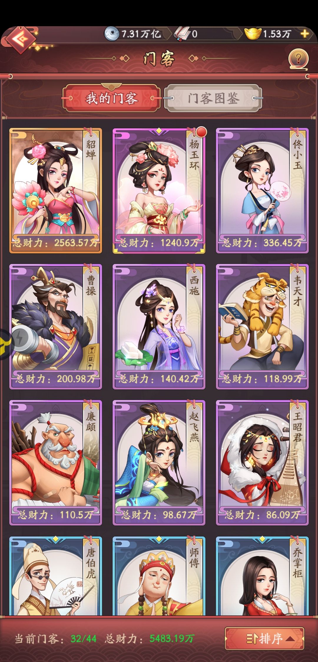 首选当然就是倾国倾城系列,光环霸道,容易入手。 全力培养一个到顶,有余力再培养其他的,有个主力打boss,商战都比较好,太平均的话抢不到boss,商战掉分多,少死一个门客就少丢点分,资质升级2星比较看脸,有点费卷轴,一星满级很容易。