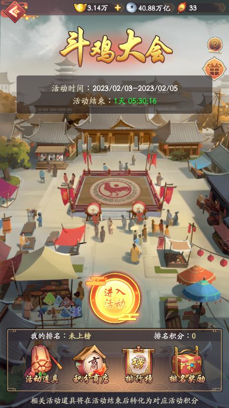 本文首发【大东家攻略组】公众号,未经授权禁止“抄袭文章”转载至其它平台。 活动名称 今天我们来介的活动是斗鸡大会的活动,这个活动也是经常在出的一个活动了,可以获得非常多门客资质的道具和挑战卷残页,相当于是一个增加门客赚钱的活动,其他的道具就是一些比较常见的材料那些了。 活动玩法 这个活动是没有像前面那些活动的玩法的就是使用活动里面的道具来获得道具,活动里面所有的道具都是需要购买的,还有一些道具是通