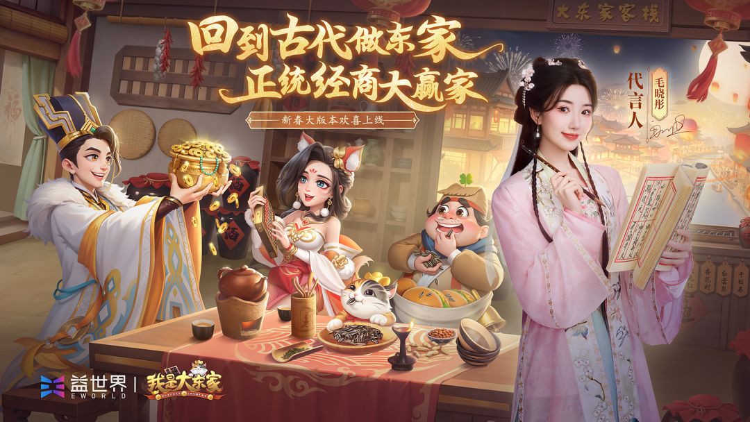 回到古代做东家,正统经商大赢家!#我是大东家新春版 上线咯! 新版本新地图,下一个目的地是:万国商博会 这里有着各国商业精英和行业顶尖新品,来自世界各地的商人即将汇聚一堂,比拼智慧与实力,赌上自己商人的身份与面子一争高下! 这可是我们一展华夏风采的好时候!我们有令人垂涎的美食、独具匠心的发明、包容并蓄的文化,这些都是我们征服万国商博会的利器! 东家们,你们准备好了吗?让我们一起,向着下一个