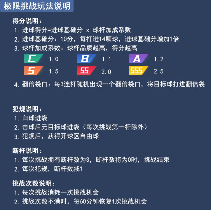 得分说明: 1、进球得分=进球基础分x球杆加成系数 2、进球基础分:10分,每打进14颗球,进球基础分增加1倍 3、球杆加成系数:球杆品质越高,得分越高 C级球杆:1.0 B级球杆:1.1 A级球杆:1.2 S级球杆:1.5 SS级球杆:2.0 SSS级球杆:2.5 4、翻倍袋口:每3连杆随机出现一个翻倍袋口,将目标球打进翻倍袋 犯规说明: 1、白球进袋 2、击球后无目标球进袋(每次挑战第一杆除外