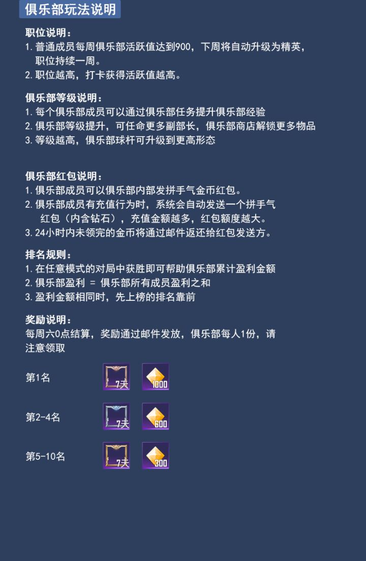 职位说明:1、普通成员每周俱乐部活跃值达到900,下周将自动升级为精英,职位持续一周。2、职位越高,打卡获得活跃值越高。俱乐部等级说明:1、每个俱乐部成员可以通过俱乐部任务提升俱乐部经验2、俱乐部等级提升,可任命更多副部长,俱乐部商店解锁更多物品3、等级越高,俱乐部球杆可升级到更高形态俱乐部红包说明:1、俱乐部成员可以俱乐部内部发拼手气金币红包。2、俱乐部成员有充值行为时,系统会