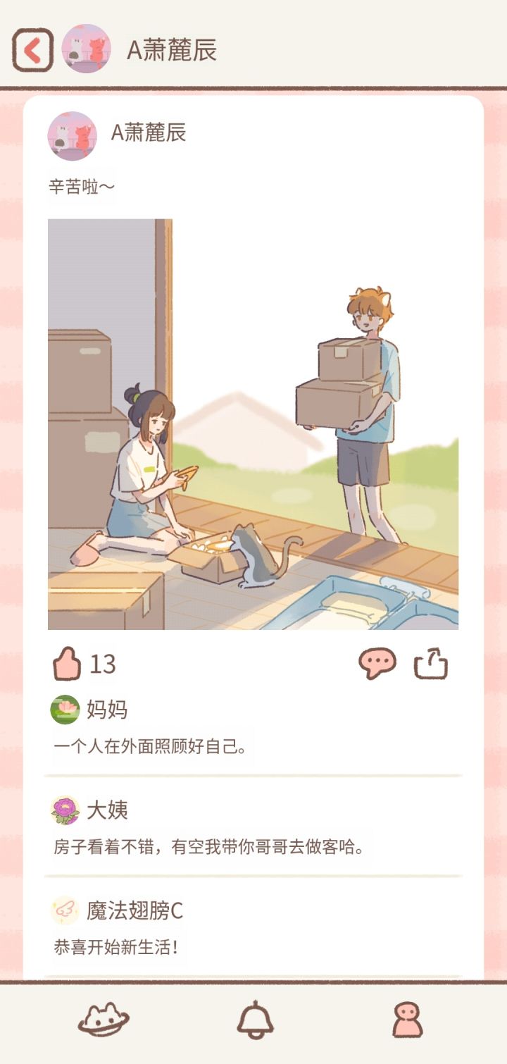 2.可以的话,有点想让游戏角色可以在喵圈的动态下面回复我,就像喵圈发短信的那种方法,我感觉这样对我来说,这个游戏又可以多一个喜欢的快乐玩法了。