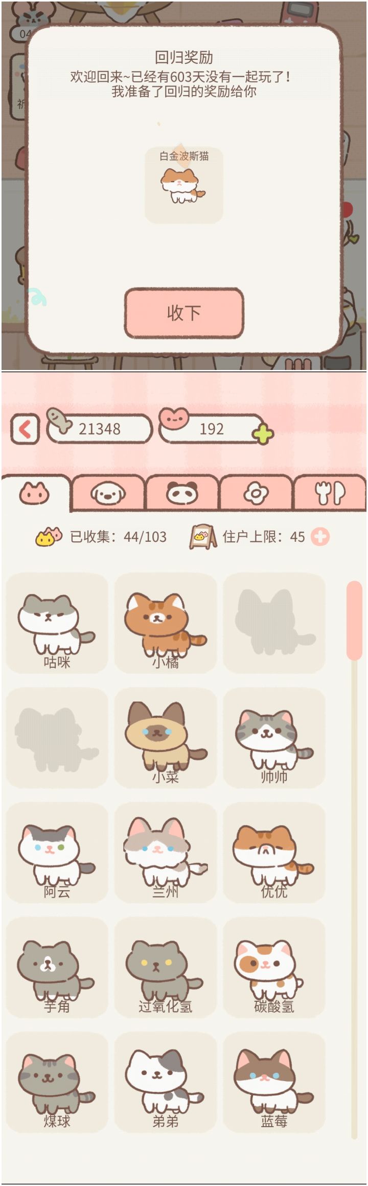 我应该算是开服玩家,刚开始的小猫我基本都收集了,初中开始玩的,它主要依赖看视频,来获得资源,然后可以收藏很多东西,刚开始东西不是很多,基本上看视频就可以集齐,所以初中我经常刷广告集物品和小猫。但是后来我上高中基本没有玩手机的机会,就没再玩过了,我的高中基本两三个礼拜才能碰一次手机我就没玩这个游戏了。