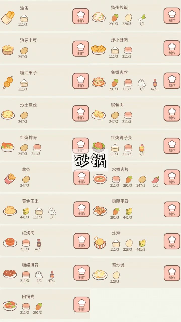 已经更新新菜品的菜谱了♡(不懂得可以在评论区问我,秒回放心) 所有调料和零食都是在扭蛋机获得的哦(还有葱,辣椒之类的!) 感谢taptap@赵 宝宝提供漏掉了三个菜品,锅包肉,回锅肉和糖醋排骨。 如果我有都漏掉的欢迎大家在评论区提醒我,我会及时更新上,尽可能的提供更全面的菜品!