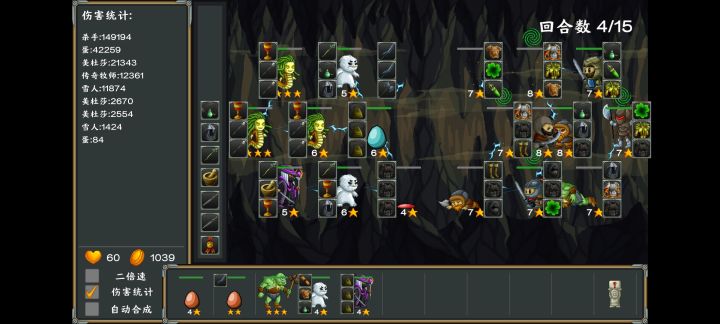 我也是个萌新,看各种攻略玩了几天。目前感觉最好用的还是骨龙,同星级和传奇牧师伤害差不多,暴击那个射手很垃圾打不出伤害千万别玩,又不能挣钱,可能我不会吧,按攻略照搬的真的很垃圾。骨龙能带黄金匕首打金币,有骨龙的阵容可以苟更久,说说个人玩法,主要是巫师配连击骨龙。前期,大概150层之前吧。牧师阵容随意买,主要注意4,7号位放两个蛋给1号位连击角色凑羁绊,前期没骨龙自己看着随意攻击高星高的连击角色暂时