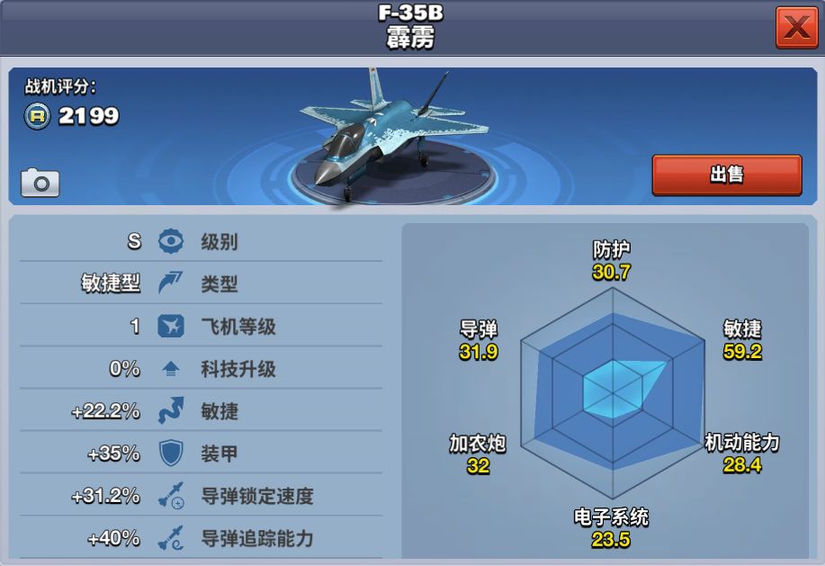 F-35B联合攻击机被视为“未来空战主力杀手”,是设计难度最大、性能最佳的机型。F-35B的特点之一是具备以前飞机不曾拥有的组合性能,即隐身、超声速和基于STOVL的灵活性。 F-35B 霹雳在游戏中是一架S级敏捷型飞机,敏捷高、锁定快、装甲厚,堪称“六边形战士”。导弹追踪还能达到15,是争霸赛玩家的最爱。当玩家等级达到35级时解锁,使用6000钻石购买。
