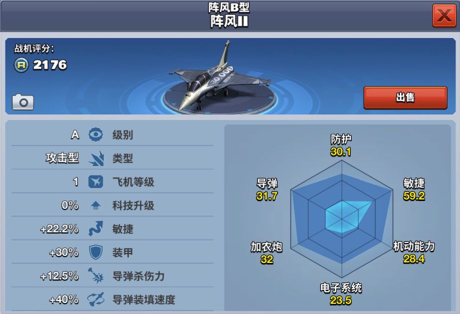 阵风B是阵风C战斗机的双座型,是一款双发、三角翼、高机动性、多用途第四代半战斗机。阵风战斗机真正的优势在于多用途作战能力,这款战斗机是世界上“功能最全面”的,不仅海空兼顾,而且空战和对地、对海攻击能力都十分强大。 阵风B型 阵风II在游戏中是一架A级攻击型飞机,是A级最强攻击机之一,装填快,敏捷高,不过毕竟攻击机,灵活性还是不如敏机的。该战机是首充飞机二选一中的飞机,若选了另外一架,在飞机推荐商城