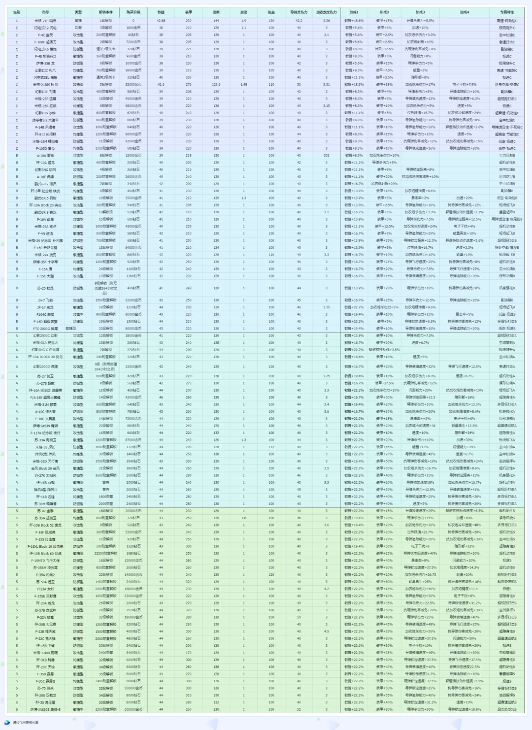 自《空战争锋》V2.9版本上线以来游戏中目前一共有96架飞机可获取 其中C级19架、B级24架,A级24架,S级29架 大家一定都想知道这些飞机的属性吧让我们一起来看看吧。 注:数据可能随着版本更新而调整,以在线版本为准