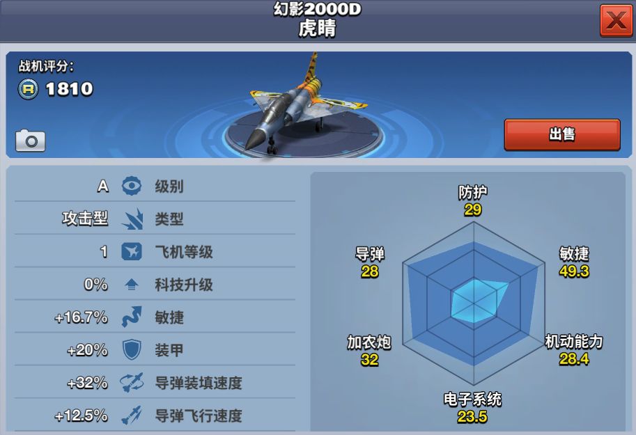 幻影2000D虎晴是幻影2000的改进型,一款双座常规打击机。使用常规武器的战斗轰炸型,不具有核武投射能力,也无法使用ASMP空对地导弹,于1991年2月19日首都试飞。 该飞机为新手签到第七日签到奖励,如果错过,在飞机推荐商城花费32000金币可获得。幻影2000D虎晴是一款金币机,价格便宜,属性良好,适合2V2联机对战,属于A级攻击型飞机。
