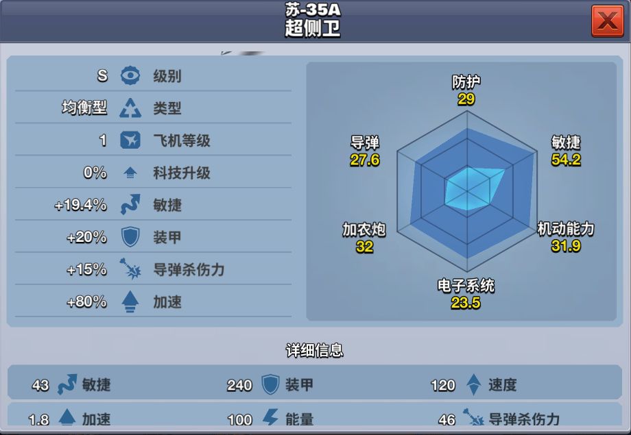 苏-35A超侧卫是俄罗斯苏霍伊设计局在苏-27战斗机的基础上研制的深度改进型单座双发、超机动性多用途战斗机,在世代上属于第四代战斗机改进型号,即第四代半战斗机。该机外形整体而言非常简洁,大部分天线、传感器都改为隐藏设计。 玩家等级达到800勋章即可解锁该架飞机,只需花费320钻石可以获得,也可消耗480钻石提前购买。苏-35A超侧卫能够用最短的时间加速到最大的速度飞行,各方面的属性都适中,是一款S