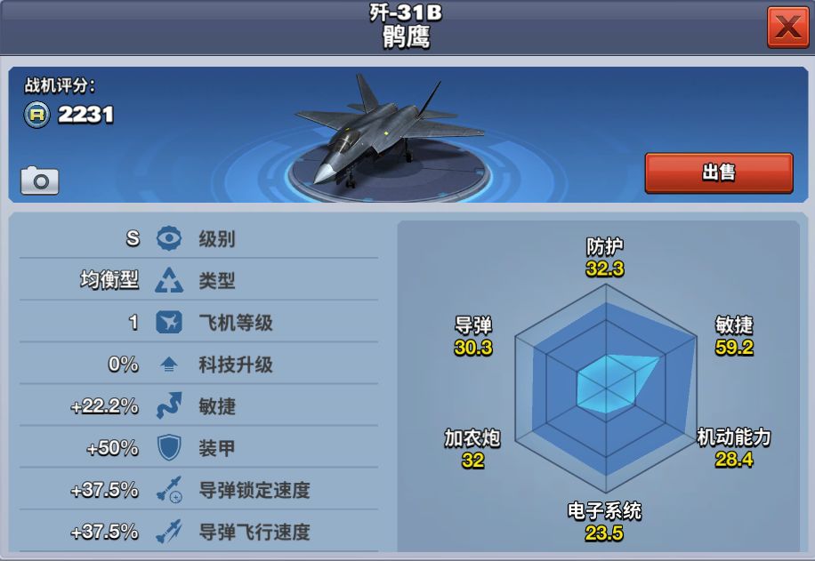 歼31B 鹘鹰是我国研制的第五代单座双发隐形战斗机。歼31B 鹘鹰战斗机具有高生存力:低雷达可探测性、低红外辐射特性、优异的电子对抗性能、低易损性设计;多任务能力:强大的目标探测和外部信息综合能力、优异的态势感知和信息共享能力、超视距多目标攻击和大离轴角全向攻击格斗空战能力、对地和海面目标精确打击能力、适应复杂气象条件和广地域使用能力;优异的综合保障能力;高性价比。 在游戏中,歼31B 鹘鹰是一架
