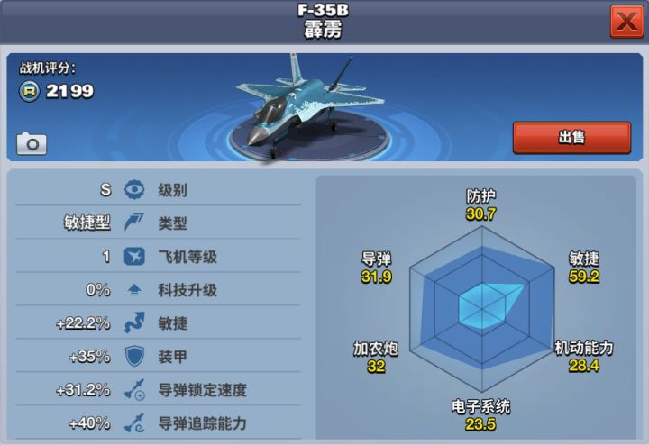F-35B联合攻击机被视为“未来空战主力杀手”,是设计难度最大、性能最佳的机型。F-35B的特点之一是具备以前飞机不曾拥有的组合性能,即隐身、超声速和基于STOVL的灵活性。F-35B 霹雳在游戏中是一架S级敏捷型飞机,敏捷高、锁定快、装甲厚,堪称“六边形战士”。导弹追踪还能达到15,是争霸赛玩家的最爱。当玩家等级达到35级时解锁,使用6000钻石购买。