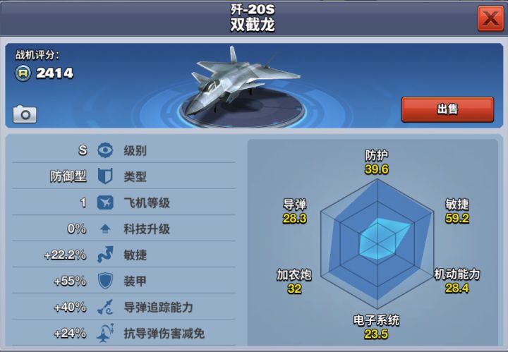 歼-20S 双截龙是一款双座双发重型隐形战斗机,具备高隐身性、高态势感知、高机动性等能力的隐形第五代战斗机,歼-20S 双截龙的机头、机身呈菱形,垂直尾翼向外倾斜,起落架舱门采用锯齿边设计,采用鸭翼式布局,这种布局有利于超音速巡航,并且还能有效减少雷达反射面积。歼-20S 双截龙在游戏中是一款S级防御型战机,当等级达到34级时解锁,价格为8000钻石,歼-20S 双截龙的导弹杀伤力较弱,机炮杀伤