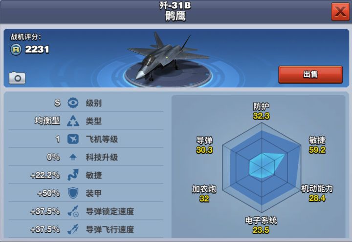 歼31B 鹘鹰是我国研制的第五代单座双发隐形战斗机。歼31B 鹘鹰战斗机具有高生存力:低雷达可探测性、低红外辐射特性、优异的电子对抗性能、低易损性设计;多任务能力:强大的目标探测和外部信息综合能力、优异的态势感知和信息共享能力、超视距多目标攻击和大离轴角全向攻击格斗空战能力、对地和海面目标精确打击能力、适应复杂气象条件和广地域使用能力;优异的综合保障能力;高性价比。在游戏中,歼31B 鹘鹰是一架