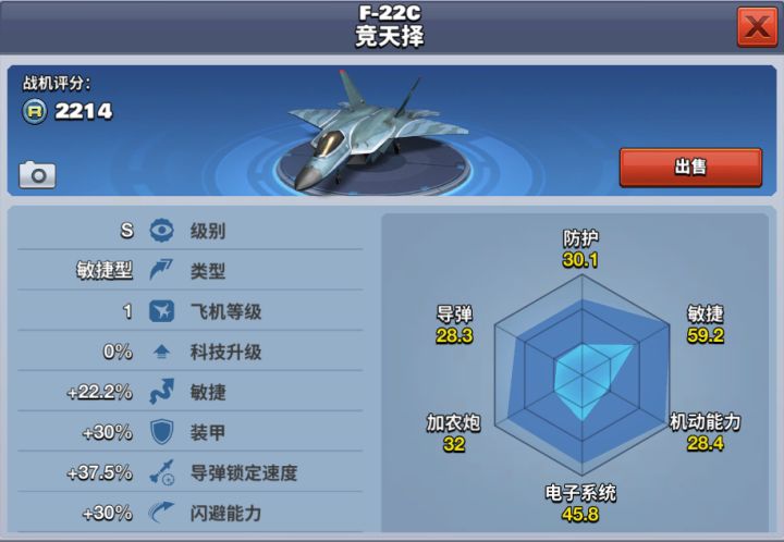 F-22C竞天择是当今世界上最先进战斗机之一。在《空战争锋》游戏中,玩家勋章达到2000可解锁此飞机,需要花费4800钻石获得。F-22C竞天择属于敏捷型飞机,锁定速度快,闪避能力强,敏捷性高,将是一款未来的1V1神器。