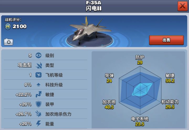 F-35A闪电II是美国一型单座单发战斗机/联合攻击机,在世代上属于第五代战斗机,是世界上最大的单发单座舰载战斗机和世界上唯一一种已服役的舰载第五代战斗机。该机具备较高的隐身设计、先进的电子系统以及一定的超音速巡航能力。主要用于前线支援、目标轰炸、防空截击等多种任务。该架飞机22级解锁,需要消耗140000金币获得,提前购买需要花费4200钻石。F-35A闪电II在战斗时,可以储存非常多的能量,