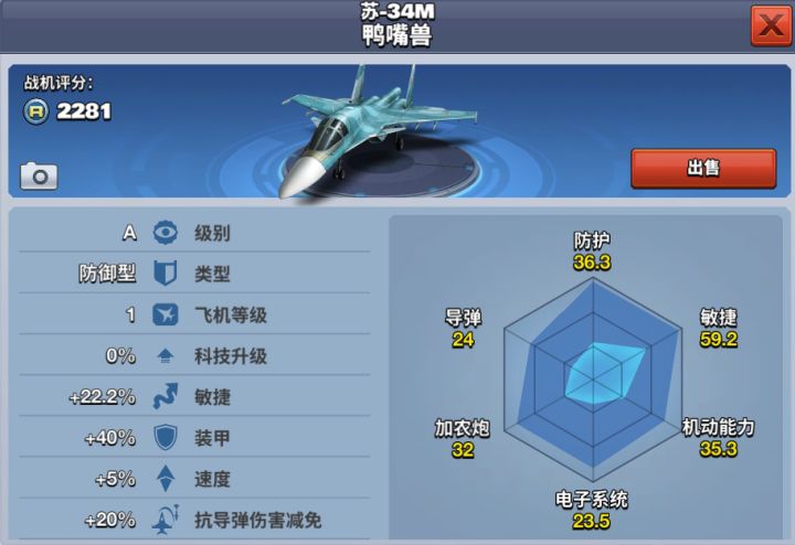 苏-35BM冲云霄是苏35的改进型,其航电系统的核心是全新的“雪豹”-E相控阵雷达,具有超群的目标探测距离。该机主要缺陷在于隐身能力不足,但是在探测能力和机动性能上已接近F-22的水准,面对除F-22之外的其他西方战机已拥有较大的优势。玩家勋章达到800即可解锁该架飞机,需要花费2000钻石获得。苏-35BM拥有良好的锁定速度属性加成和较好的加农炮精准度,适合用机炮打击敌机,是一款S级均衡型飞机