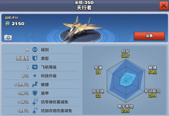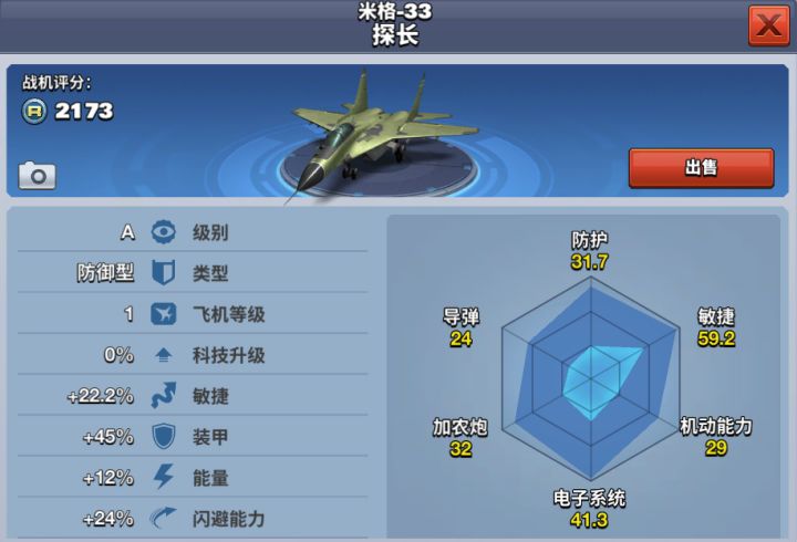 米格-33探长实际上为米格-29M,是在米格29基础上经全面现代化改进而成的新型多用途歼击机,是前苏联计划参照F-16设计思想研发的单发轻型战斗机。该机采用全后掠下单翼,双垂尾正常式布局,带有较宽的机翼前缘边条。米格-33探长是一款能量储存值大的A级防御型飞机,便于做特技动作;也是所有飞机中闪避能力最为突出的一架飞机。玩家达到1000勋章解锁,需花费1320钻石购买获得。