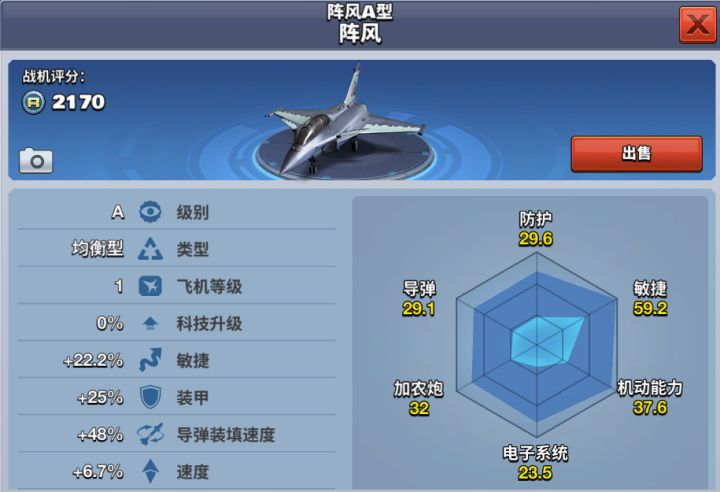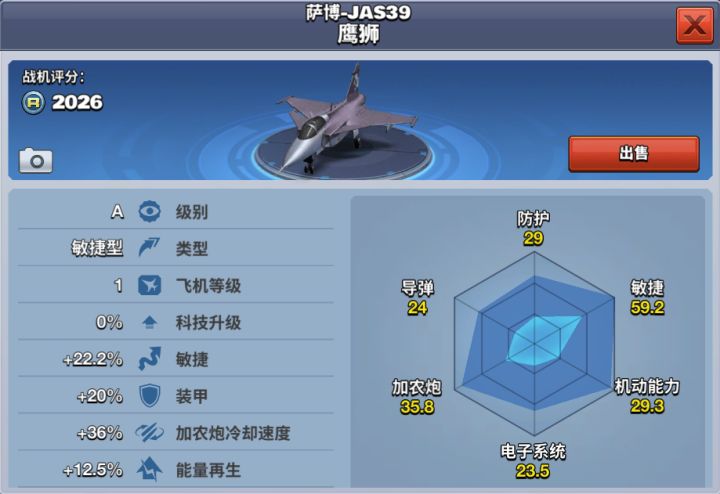 萨博-JAS39鹰狮用以取代萨博-37战斗机,是瑞典一型战斗机,在世代上属于第四代战斗机。该机兼具战斗、攻击、侦察等多功能特点,由鸭型翼与三角翼组合而成近距耦合鸭式布局,继承了萨博-37战斗机的气动型,通过同时偏转鸭翼和升降舵可以产生直接升力。鹰狮战机20级解锁,需要花费880钻石获得,也可通过消耗1320钻石提前购买。在战斗中,其能量恢复速度和加农炮冷却速度都快,敏捷性能极好,适合1V1近距离