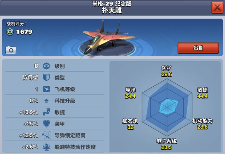 米格-29纪念版扑天雕的原型机1977年10月6日首飞,1982年米格-29在莫斯科和高尔基飞机制造厂投入批量生产,1983年开始装备部队。该架飞机涂装富有特色,红色的机身配上黄色的机翼再加上灰色的尾翼,给人眼前一亮的感觉。在同级别飞机中,其装甲、锁定距离和躲避特技动作速度属性均是最好的,它适应于大地图各个模式,是一款B级防御型飞机,当勋章达到700时解锁该飞机,价格为680钻石。