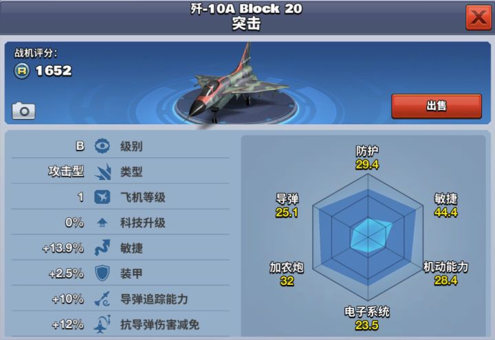 歼-10A Block20突击是是介于法国阵风战斗机和瑞典JAS-39“鹰狮”战斗机之间的中型战斗机,机动性能处于两者之间。歼-10的武器配置基本是公开的,新型国产中距空空导弹已经正式服役,并且性能可以达到近似AIM-120C的水准。但歼-10的缺点就是机体相对较小,载弹量和挂架数量比“台风”、“阵风”少,因此武器评分算是中等水准。歼-10A Block20突击属于B级攻击型飞机,拥有较好的导弹