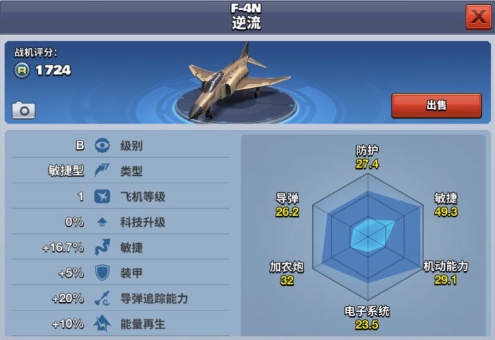 F-4N逆流是1972年“蜜蜂线”升级计划中对F-4B进行升级后的版本,性能类似F-4J水准,也有改装了无烟发动机,共改装228架。机头部相对下垂,保证以一定迎角飞行时的视野,同时也有利于对地攻击。玩家勋章达到500,即可解锁F-4N逆流,花费580钻石可获得该架飞机。该架飞机拥有较强的导弹追踪能力,良好的机动性能,是一款B级敏捷型飞机。