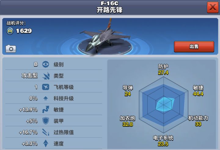 F-16A战隼是美国空军一型单座单发喷气式多用途空中优势战斗机,是美国第三代或第三代半战斗机,也是世界上最成功的战斗机之一。具备了夜战能力和发射空地导弹、反舰导弹等对面打击能力,成为多用途战斗机。该架飞机锁定锁定快,导弹杀伤力强,属于B级攻击型飞机,是一款导弹流飞机。解锁等级为15级,花费600钻石购买获得,提前购买需要花费900钻石。