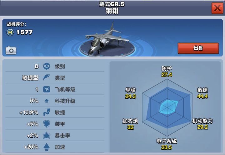 鹞式GR.5钢钳是鹞MK50的改进型,主要改进座舱盖,使用了视野良好的水滴形舱盖;更新了电子设备。采用带下反角的后掠上单翼,提供垂直起落、过渡飞行和常规飞行所需的动升力和推力,机翼翼尖、尾部和头部有喷气反作用喷嘴,用于控制飞机的姿态和改善失速性能鹞式GR.5钢钳飞机10级解锁,用35000金币就可获得,也可以花费1050钻石购买。该架飞机是一款B级敏捷型飞机,灵活性好,适合喜欢玩暴击的玩家,也是
