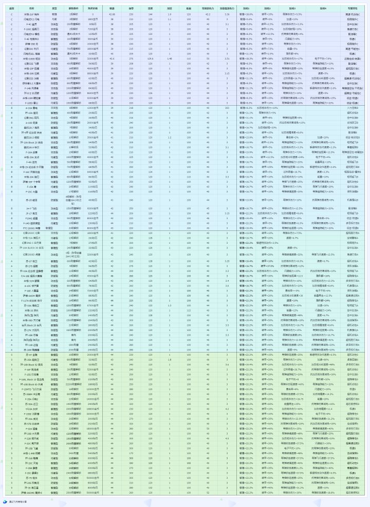 自《空战争锋》V2.9版本上线以来游戏中目前一共有96架飞机可获取其中C级19架、B级24架,A级24架,S级29架大家一定都想知道这些飞机的属性吧让我们一起来看看吧。注:数据可能随着版本更新而调整,以在线版本为准