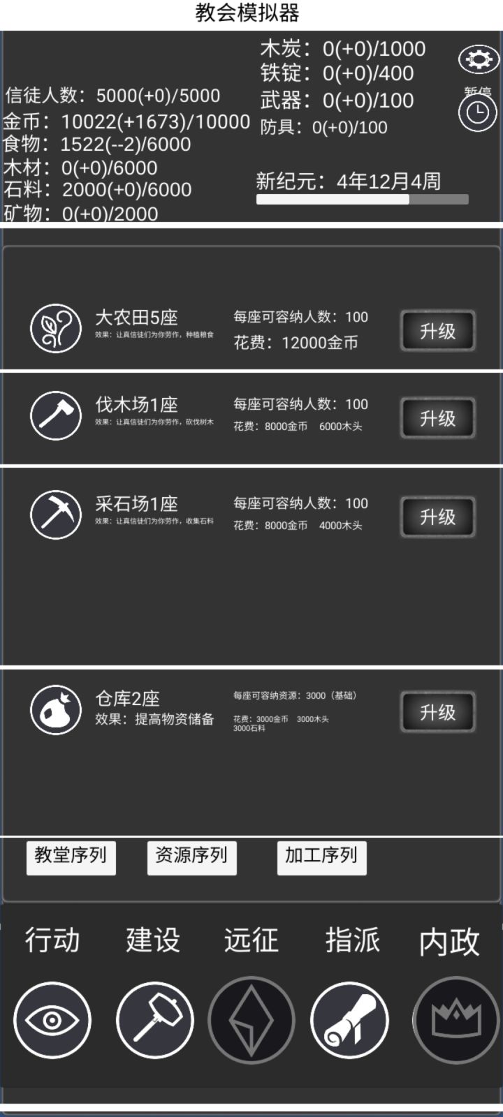 1w金币满了要升级仓库,升级仓库需要3k金币石头木头,但是开局石头木头只有2k且不在增长。想要增加木头需要更多木头来升级,但是根本没有,想要升级采石矿需要花5w金币买许可证,但是1w金币已经封顶了,无语