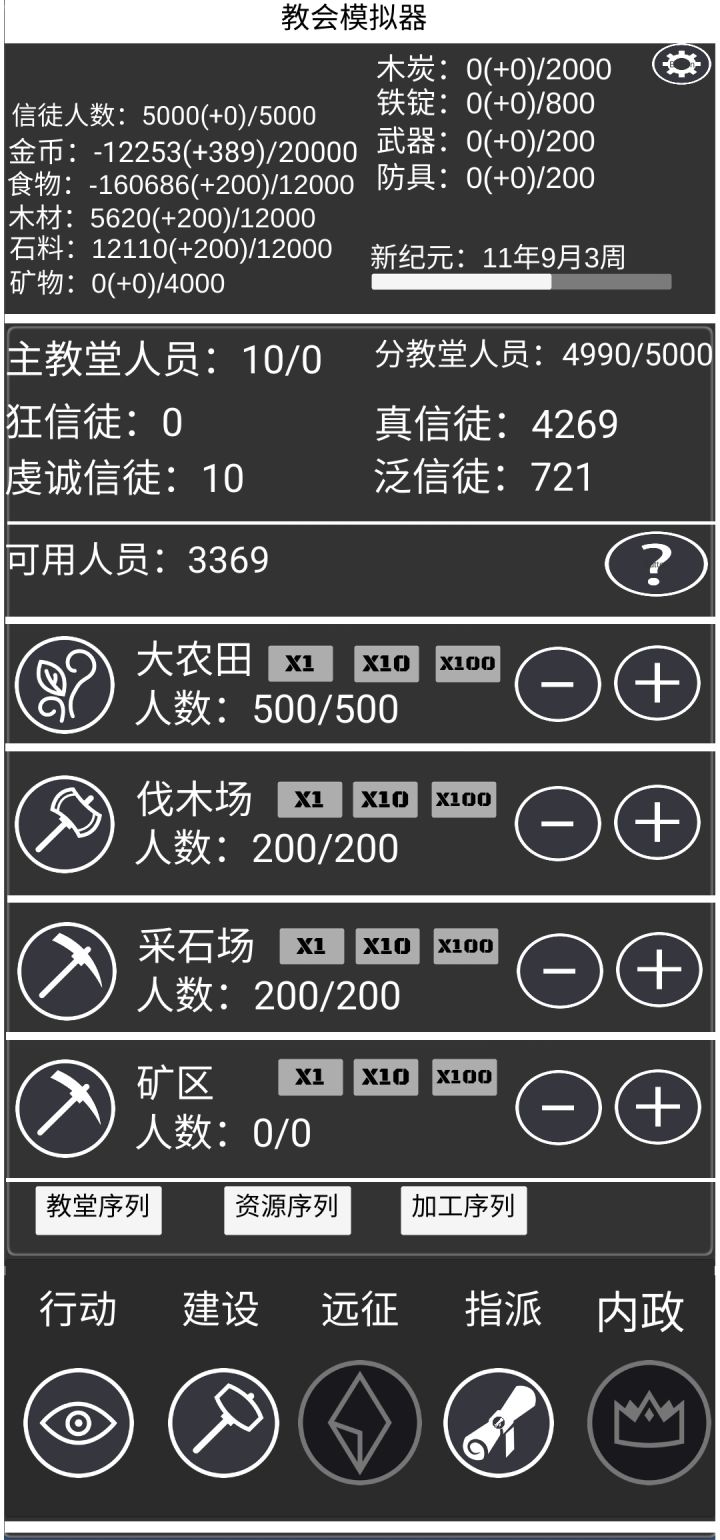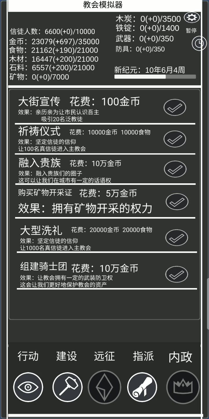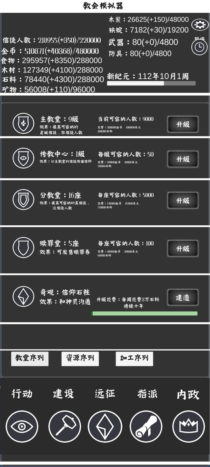 铁砂成那个点下骑士团,再点教堂试试,应该是没设置好,明天会更新石柱可以提高攻防加成,可以优先修建
