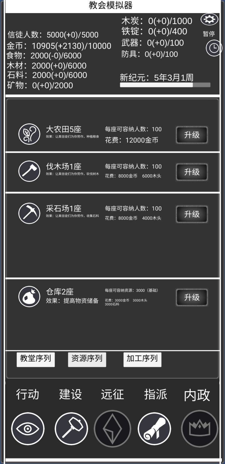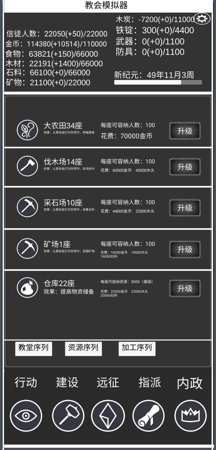 游戏的核心在于信徒,无论是金钱的收入还是任务的指派,都是要用到信徒,所以进游戏的第1件事是先通过宣传,把信徒人数拉满。然后点击指派里面的资源序列,可以分配人手进行资源上的收集来获得资源。然后利用资源在建筑那里点击资源序列进行扩建。游戏里面信徒和晋升是按比例的,也就是说基础的信徒越多,每回合增加的信徒也会更多。泛信徒越多,每回合提拔的真信徒也会越多。真信徒会开始提供金币收入,通过收入可以发展
