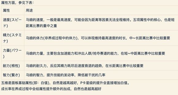 角色育成,是游戏中最为关键的核心玩法,那么如何育成,怎么育成,相信一定是大家最为关心的问题。这篇攻略我将对角色育成做一个总结与归纳首先 我们要明白的是游戏中的核心数值-角色的五维-速度 体能 力量 毅力 智力 从图中我们可以看到五项属性所分别引导的关于马娘组成的数值。并且明显的可以看出根据赛距长短,需要的属性有所不同如何提升数值呢?除了最普遍的技能卡提升,训练提升外,还有基因继承,自身开花以及觉醒