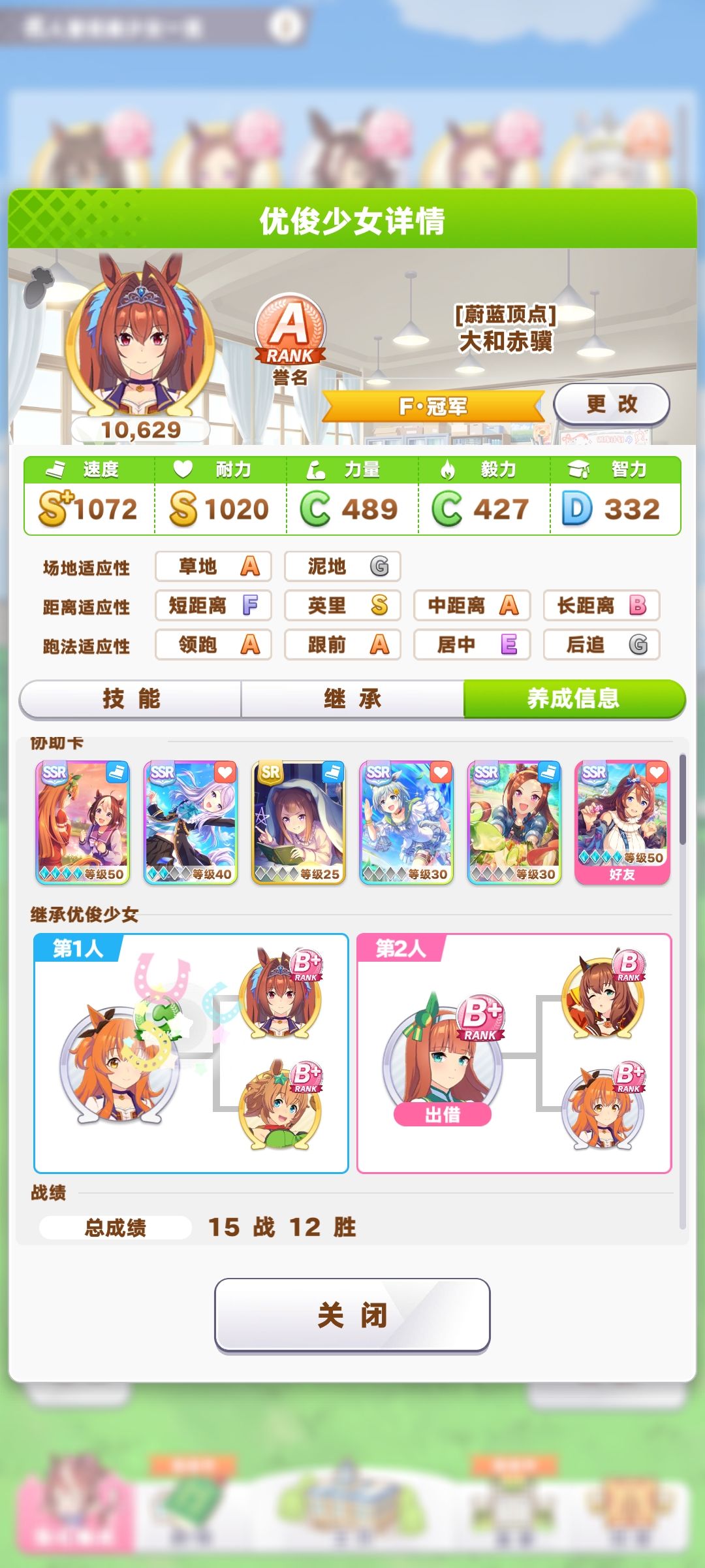 更新下,神鹰相关的九次比赛都是第一,领先第二一般在7身位。 我用的是大和,因为我只有这一个领跑的马,如果大家有铃鹿和波旁会更好。 因为本次是中距离2400米,推荐大家要把耐力拉到800以上,有金弯回最好。作为领跑最怕的就是出闸迟,如果有绿帽的话可以凹个金闸。其他就是速度越快越好,智力350以上吧,另外育成的时候最好把中距离,领跑,草地等适应性拉到s,父母有这个属性的话,会在第二年第三年随机继承,另