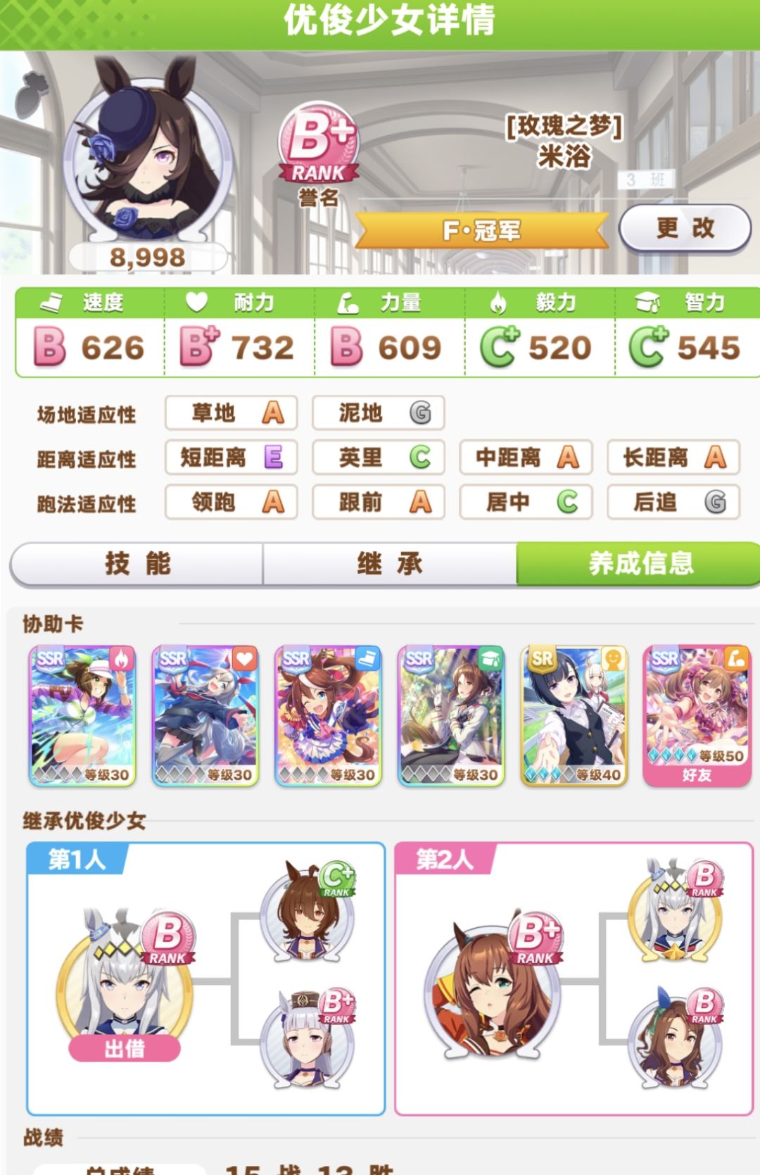 经历了一年多了,牢闪竟然真的打赢了复活赛,太惊讶了。 由于我也太久没玩了,只能给出一些自己仅存的玩法记忆,如有不对欢迎各位大佬指正。 1. 这游戏的协助卡的重要程度高于角色,除非角色本身实在是有点拉(例如乌拉拉),否则用好卡都能拉出还不错效果,所以各位新爱马仕不要将大量资源用于抽角色。 2.之前卡的重要程度基本上是速卡最重要,然后是力(英里,短程),耐(中距离,长距离)学院版本好像还是速卡最