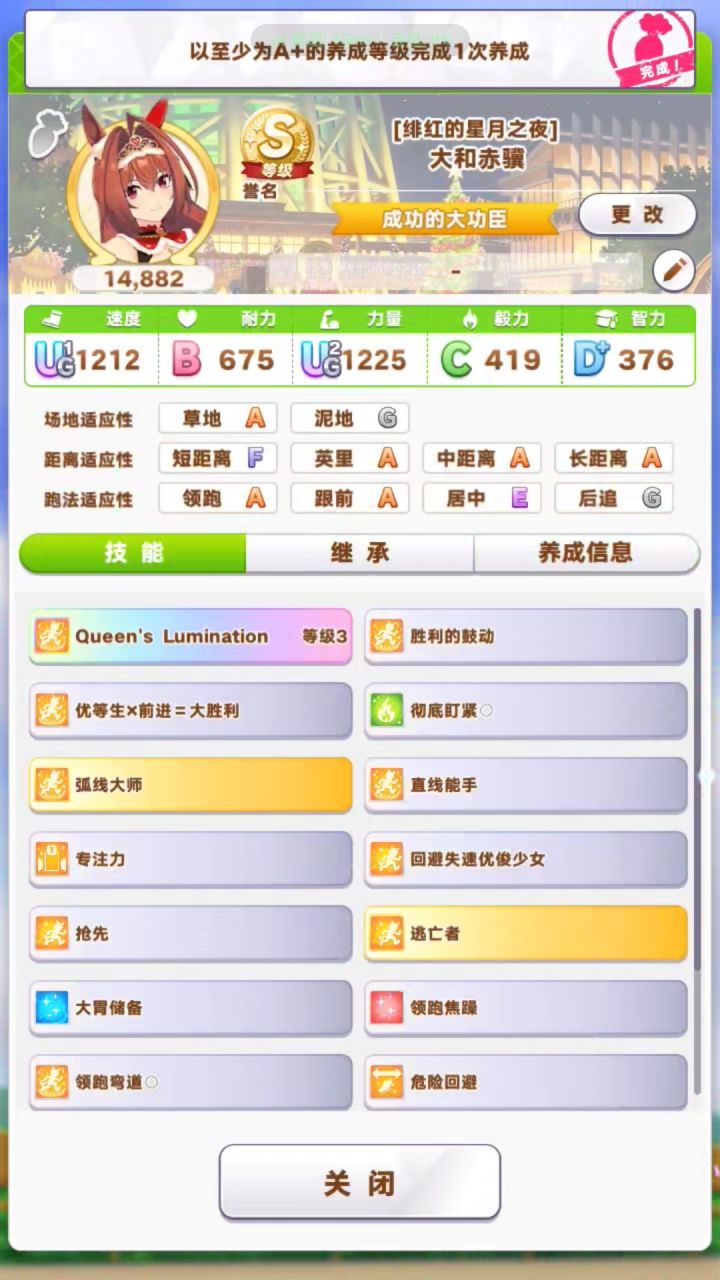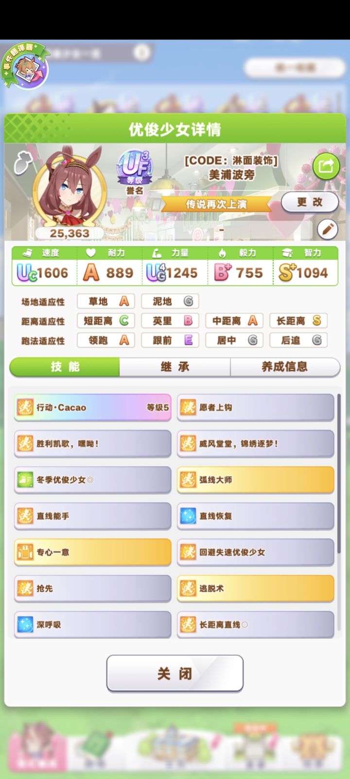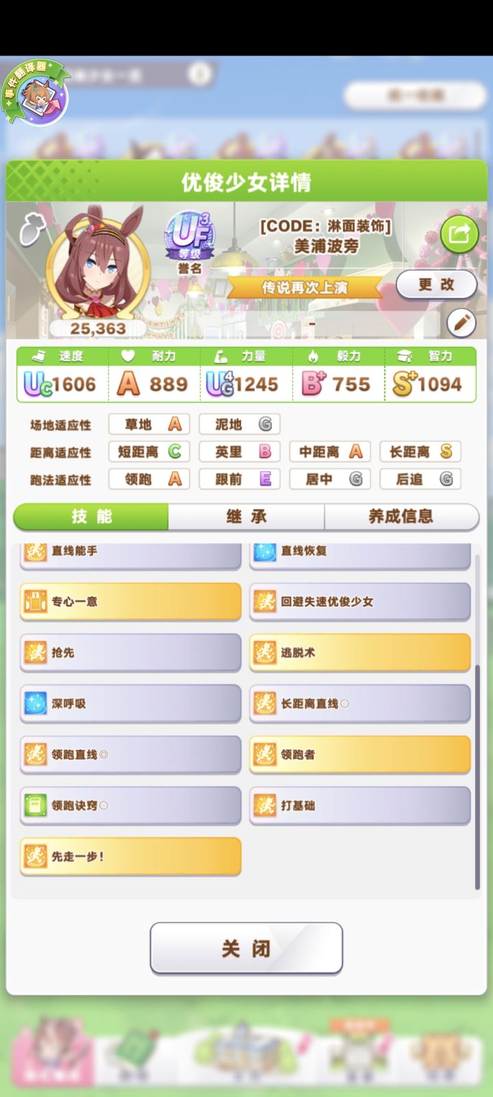 我就中期找了个机会跑了个宝盅,一个伊丽莎白,其他全都是按养成路线跑的。 而且这还有我只能说某种程度上跟啊船有地一拼了,指长距离加速末脚,尤其是跑长距离(前提是给她的B长距离适应整成A)速智流点就是了,技能拿地越多越好,因为还自带一个13次技能在加速的技能。 (我这里带地是泳装特别周,跟换皮玉澡,因为这两都是中期开两技能后在这两技能地基础上技能效果+2,对了还有个万圣节米浴) 可以给这孩子整个带啊船