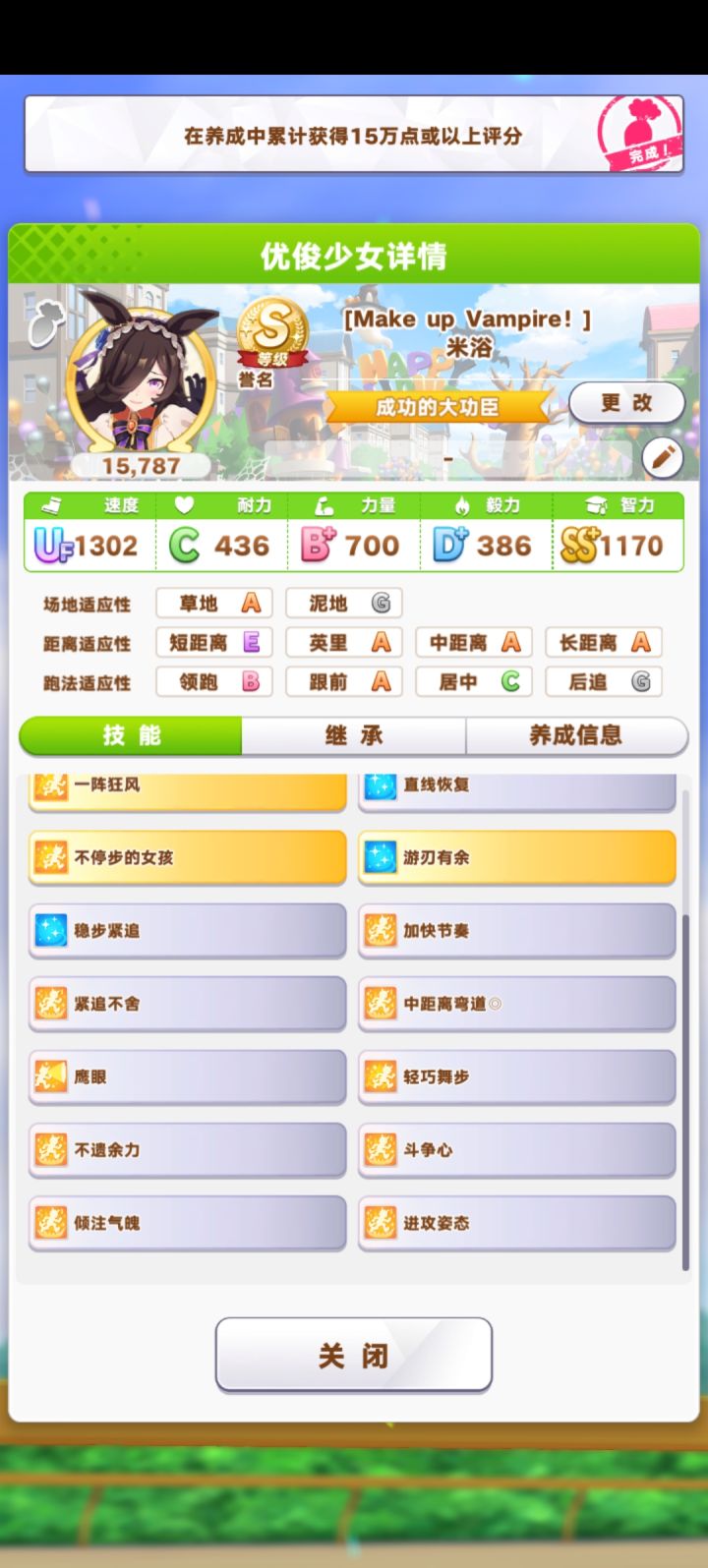 我就中期找了个机会跑了个宝盅,一个伊丽莎白,其他全都是按养成路线跑的。 而且这还有我只能说某种程度上跟啊船有地一拼了,指长距离加速末脚,尤其是跑长距离(前提是给她的B长距离适应整成A)速智流点就是了,技能拿地越多越好,因为还自带一个13次技能在加速的技能。 (我这里带地是泳装特别周,跟换皮玉澡,因为这两都是中期开两技能后在这两技能地基础上技能效果+2,对了还有个万圣节米浴) 可以给这孩子整个带啊船