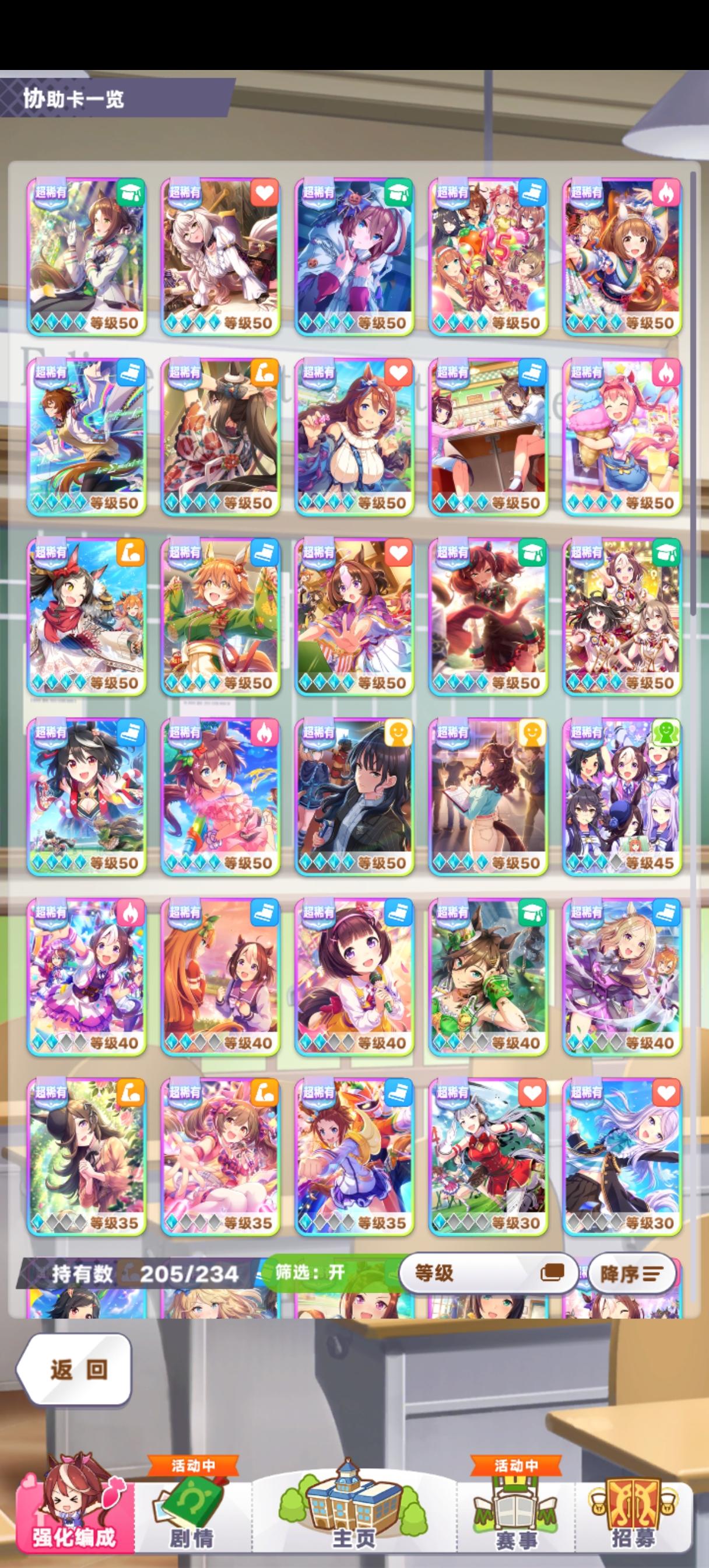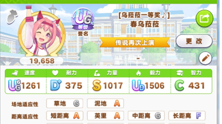 原本只能上S的乌菈菈,现在竟也能上UG,偶像杯真是太棒了!!!听UP主说偶像杯的主流玩法是速智,于是我也去玩了几天,但结果不怎么样。刚好能上SS,但离UG还差不少。(也可能是我的卡组不好,SSR速智卡都是低破,不好用;SR卡满破后大多也只有35擅长,训练的时候擅长率低那就真没法玩了。)所以我就换回巅峰杯的友根玩法了。但没想到效果出奇的好,甚至还连着两把UG3,直接破了我之前的纪录。速智就只
