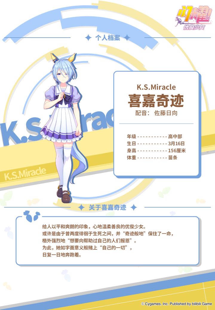 姓名--喜嘉奇迹(配音:佐藤日向)年级--高中部生日--3月16日身高--156厘米体重--苗条给人以平和爽朗的印象,心地温柔善良的优俊少女。或许是由于曾两度徘徊于生死之间,并“奇迹般地”保住了一命,格外强烈地“想要向帮助过自己的人们报恩”。为此,她如字面意义般赌上“自己的一切”,日复一日地奔跑着。“总有一天,我一定会创造‘奇迹’的。请你……一定要看着我。”————————
